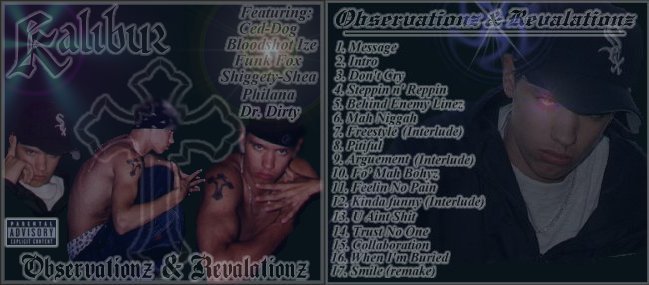 (Mister X) Thiz section of the page iz dedicated to my homie Kalibur (Kalibur From X Musik), To represent hiz new Cd Observationz & Revalationz.He haz been asking me to throw a page u with hiz audio on it , in return i get a the hook up on hiz cd , So here it iz ,